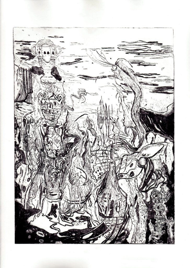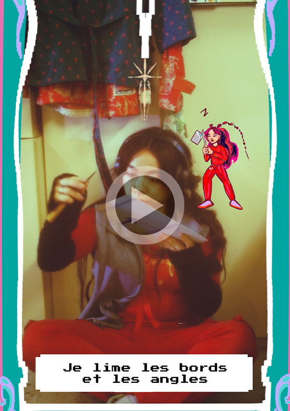 Cette gravure représente un univers marin imaginaire peuplé par des poissons rubans humanoïdes, elle donne grâce au sentiment de retrouver quelque chose au fond de nous d’assez ancien, qu’on a toujours souhaité. Le motif de l’océan en général puis de l’abysse me ramène à cet état psychologique et émotionnel. La vidéo convoque une iconographie du jeu vidéo où un petit personnage, mon alter ego vient à ma rencontre.La storytelleuse raconte son petit personnage (une mini héroïne dessinée) qui la suit dans son atelier et grave à ses côtés. Sans nul besoin de l’affirmer, elle nous montre qu’elle est bien consciente de se raconter à l‘autre. Elle est maitre et narratrice de tout cet univers. Sa version animée témoigne du sentiment de retrouver ce qui fait à la fois rêve/racine. Ce qui dans notre intériorité est le plus précieux, le nouveau et l’impermanent et pourtant toujours là, à regarder au fond de nos yeux quand on le regarde.